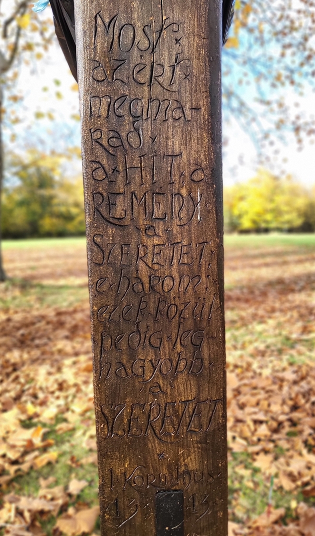 És nem messze innen, a fák között egy faragott oszlopon ott áll az ő kedvenc igéje: